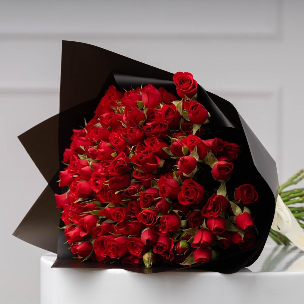 30 Baby Rose – Red, 1 Ribbon – White, 2 Wrapping – Black