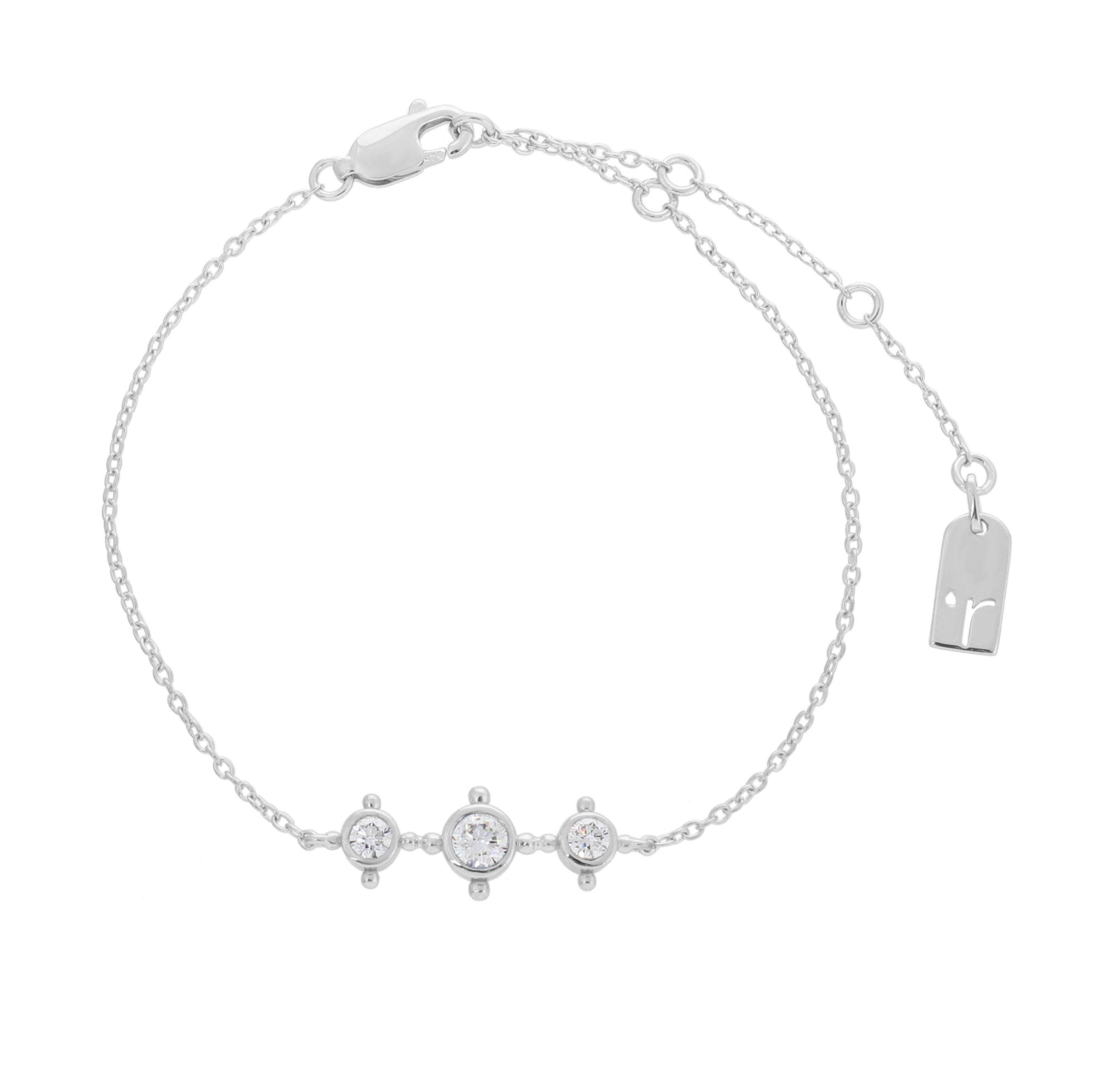 A bracelet that captures the beauty of simplicity in its purest form: three transparent compartments stacked on a thin line of silver, like tiny dots of light that rest on the wrist. Its details inspired by the Asiri cat rose give the design a special personality without weighing down its look. Crafted from recycled 925 carat silver, it is encased in a rhodium coating to maintain its quiet silver shine. The chain is adjustable, to fit different sizes and sits gently on the hand. A piece that gives you a simple glow... A slight flash passes and then its trace remains.