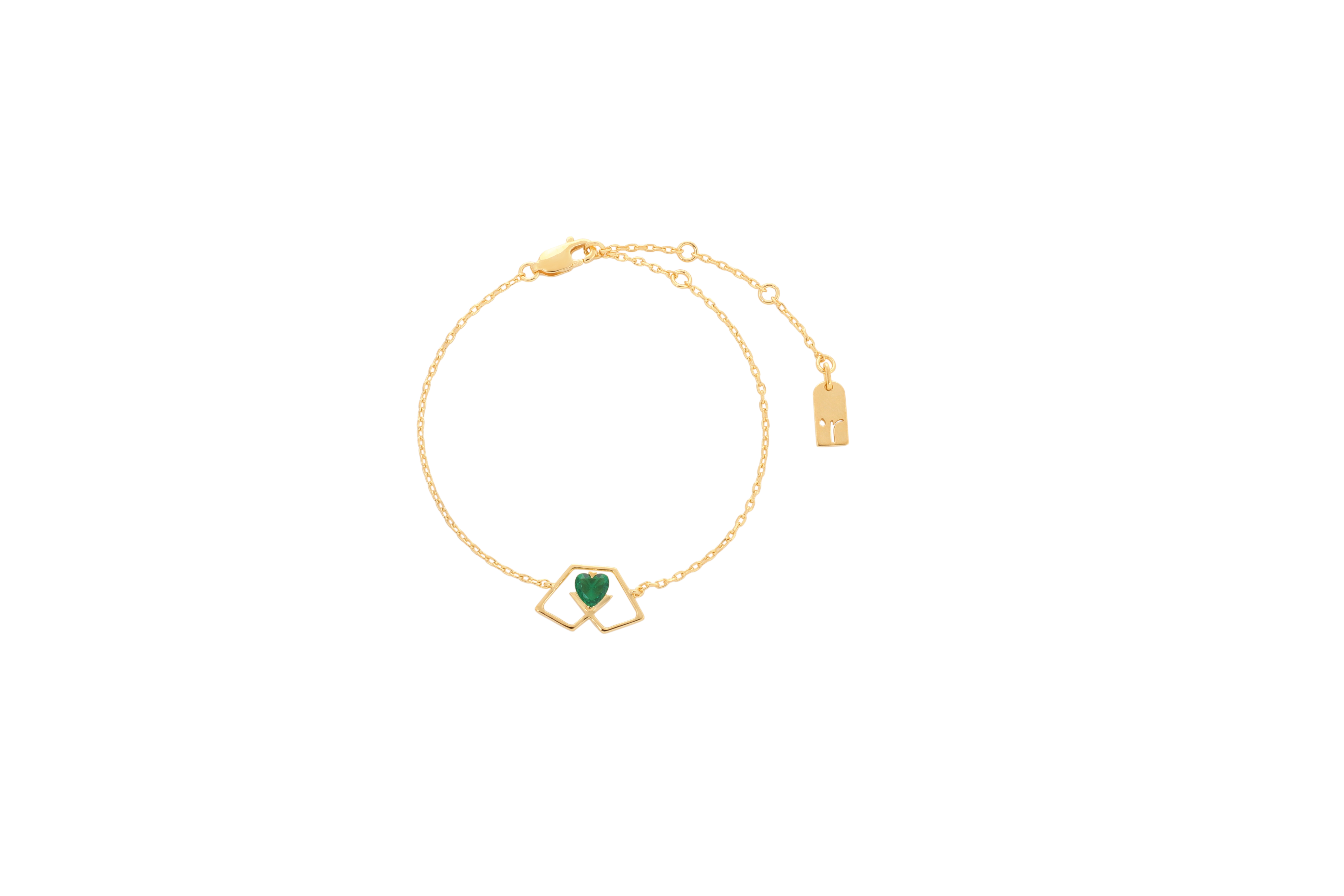 Pulse bracelet made of 925 carat recycled silver, plated with 25 layers of 18k gold to give it a warm color and long-lasting shine. It comes with an adjustable chain to fit different wrists comfortably and elegantly. At the centre of the bracelet is a geometric heart that embraces a vibrant emerald green zirconia stone, which reflects light deeply and gives the piece a striking presence. The golden sparkle and the green gradient combine to create a bracelet that combines modernity and delicacy. A piece that carries its pulse... In a more powerful color.