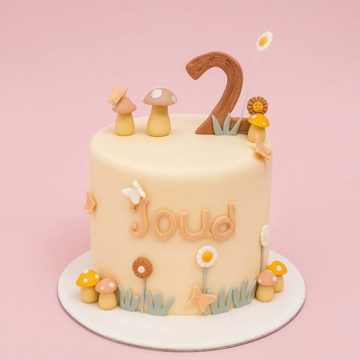 A kids birthday cake inspired by nature featuring mushrooms flowers and soft colors creating a sweet joyful atmosphere perfect for celebrating a child second birthday