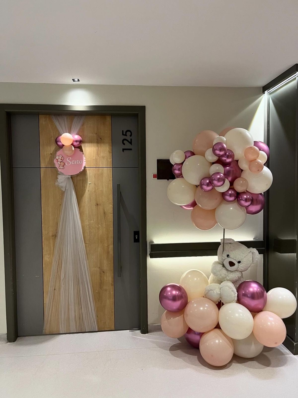 Newborn welcome balloon decoration featuring two elegant balloon sets, customized baby name display, and stylish room door decoration. Perfect for hospital or home celebrations. Choose balloon colors and baby name in the notes.