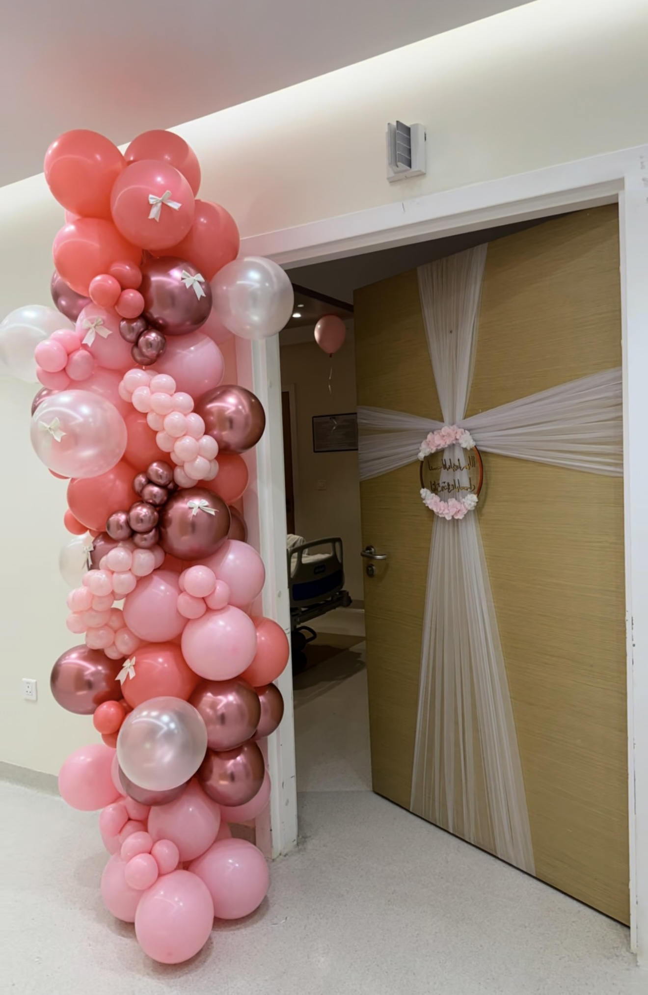 ديكور استقبال مولودة بعمود بالونات بدرجات الوردي مع بالونات كروم ولمسات ناعمة داخل الغرفة، مع تزيين باب الغرفة بقماش التول ولوحة باسم المولودة. يمكن تخصيص الألوان والاسم حسب الطلب.