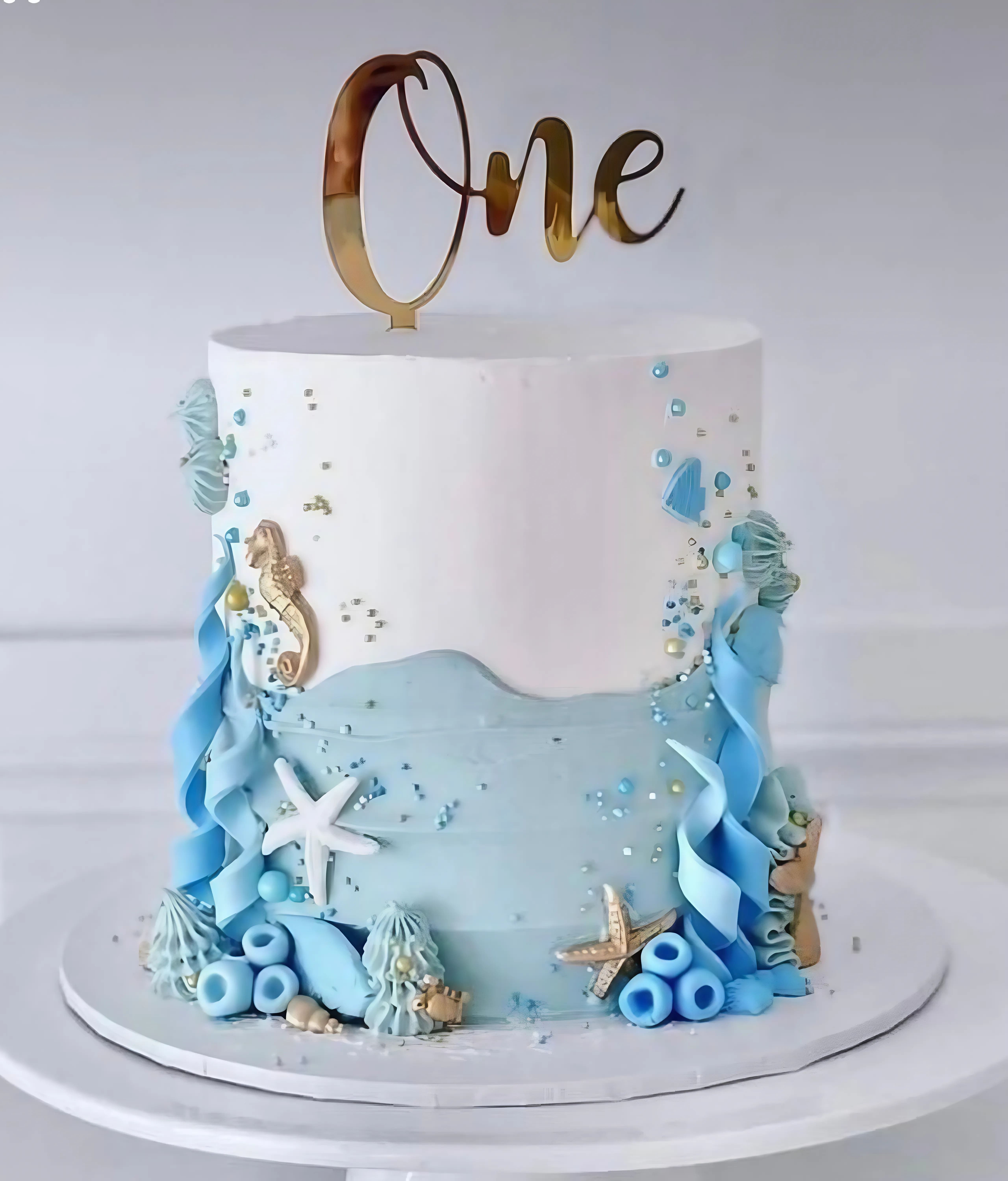 كيكة ميلاد بتصميم بحري ، تجمع بين الأبيض والأزرق ، مزينة بنجوم البحر، فرس البحر، وأصداف من الحلوى، مع لمسات ذهبية براقة و topper يحمل كلمة