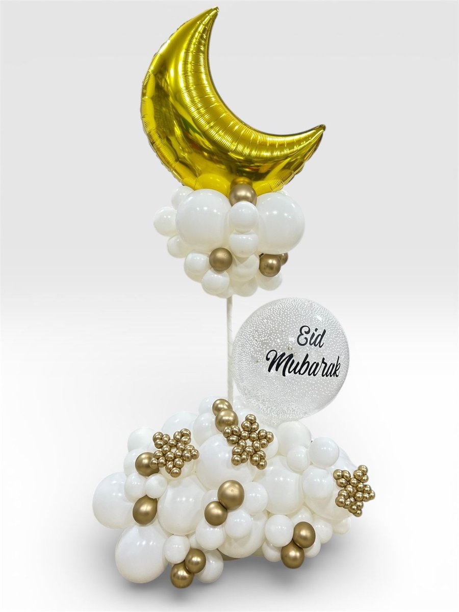 تصميم العيد|Royal Crescent يتكون من: -3نجوم صغيرة ملتوية في قاعدة بالونات مميزة -بالون بابل 24انش يحتوي علي حبيبات فوم بيضاء مطبوع عليها Eid Mubarak -هلال ذهبي مميز 70سم و من اسفل قاعدة بالونات صغيرة