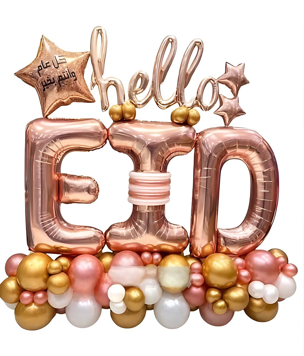 تصميم احتفال بالعيد يتكون من: -عبارة hello روز قولد -حروف كبيرة روز قولد EID مقاس 34انش -قاعدة بالونات أورقانيك -نجمة مقاس 18انش