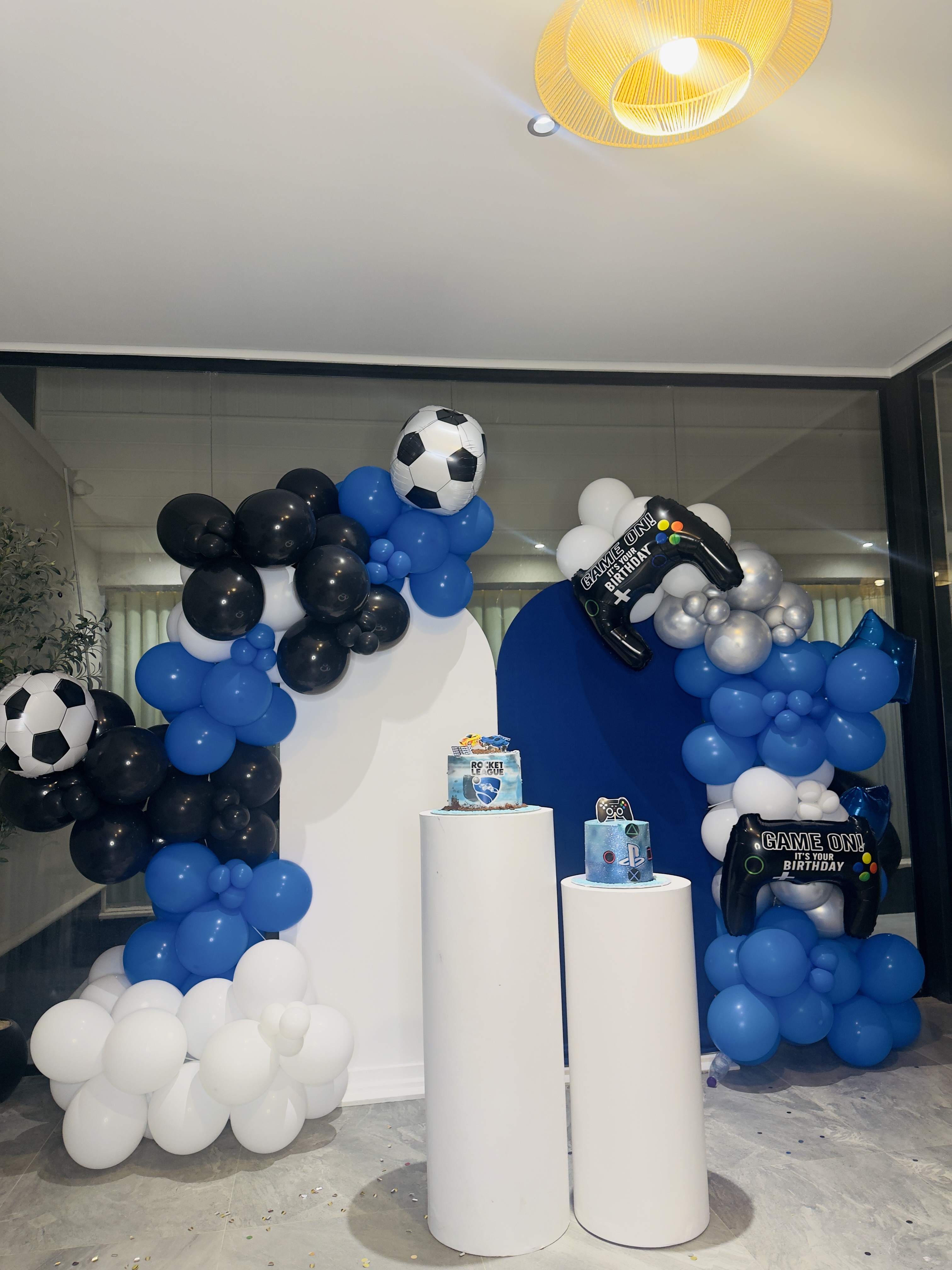 ديكور عيد ميلاد ثيم كرة قدم وألعاب بقوسين بالونات أزرق وأسود وأبيض، مع بالونات كرة قدم وأذرع تحكم ألعاب، وخلفيتين متناسقتين مع ستاندات عرض للكعك. مناسب لحفلات الأطفال.