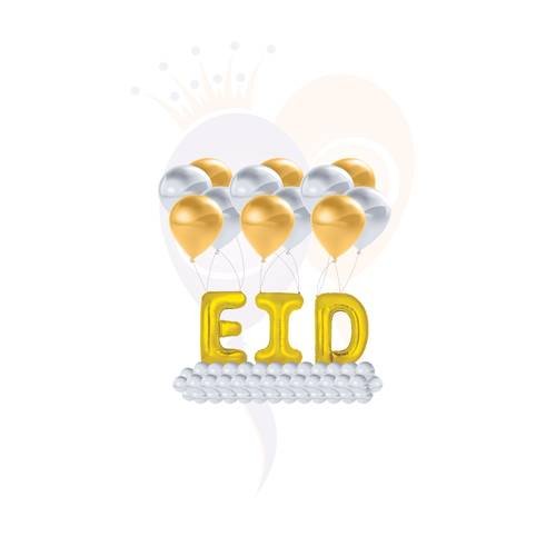 تصميم بالحروف الطائرة المميزة من بالونايزر لمناسبة العيد بعبارة EID -حروف ذهبي صغيرة مقاس 16 انش مع قاعدة بالونات باللون الفضي و بالونات هيليوم علوية باللونين الفضي و الذهبي