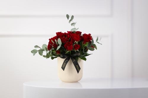 10 روز أحمر، 10 بيبي روز أحمر، 2 اكليبتوس أخضر، 1 فازة سيراميك 15×15 سكّري