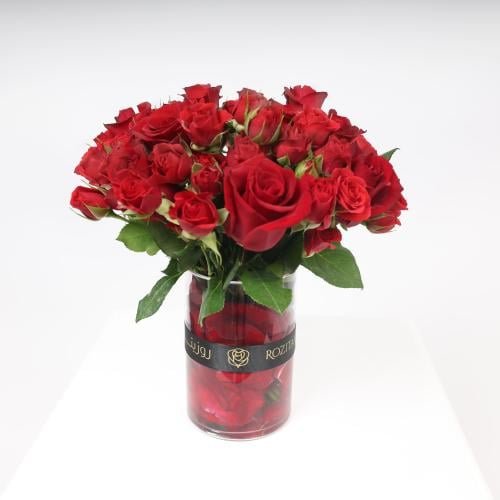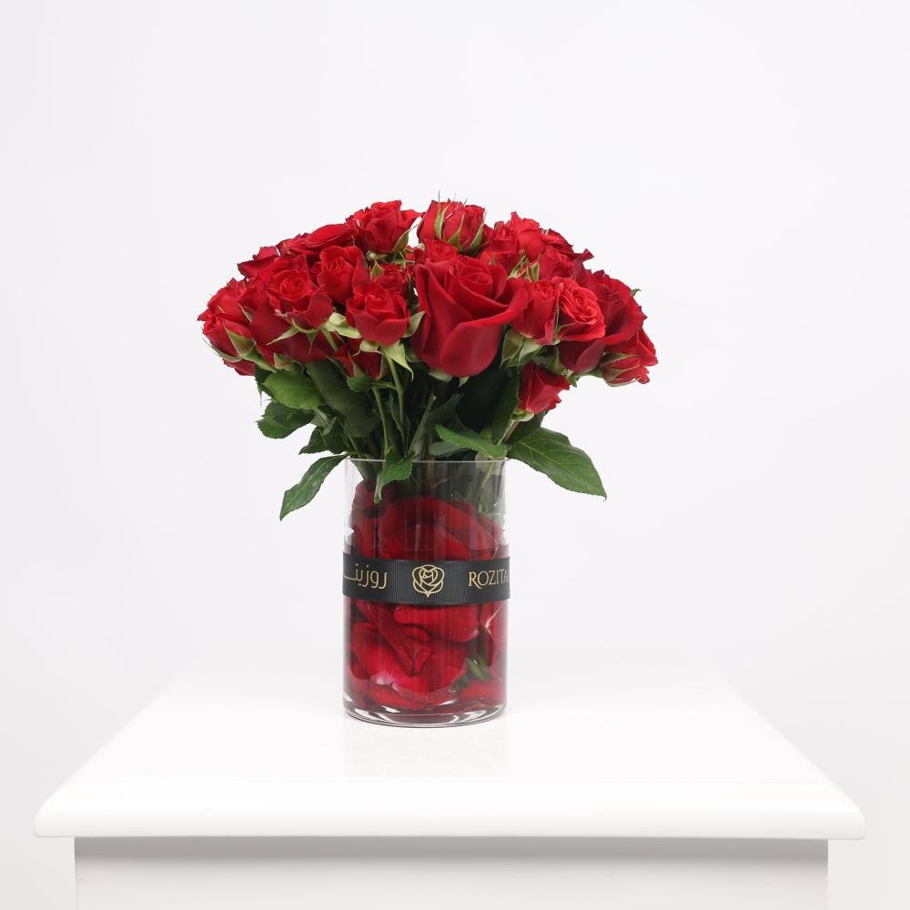 10 جوري – أحمر، 1 فازة 15 – شفافة، 10 بيبي روز – أحمر