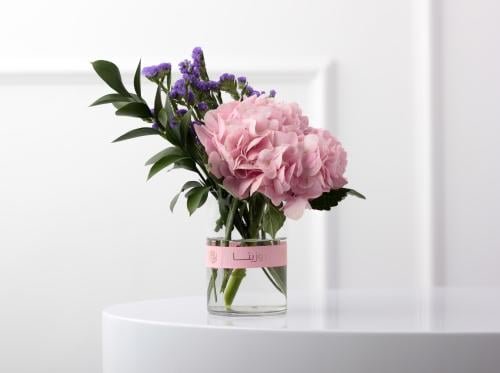 1 هيدرينجيا وردي، 3 استاتيس أزرق، 2 صفندر أخضر، 1 فازة زجاج 15×16