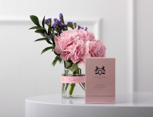 1 هيدرنجيا وردي، 3 استاتيس أزرق، 2 صفندر أخضر، 1 مع عطر دي مارلي، 1 فازة زجاج 15×15 شفافة