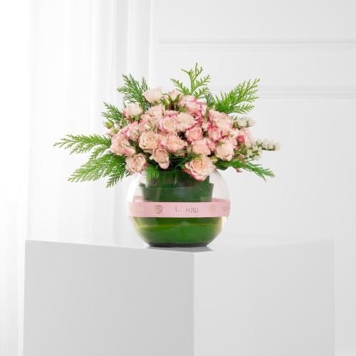 10 بيبي روز دبل كلر، 4 كونفير أخضر، 2 استاتيس أبيض، 1 فازة مقاس 20 كوروي شفاف