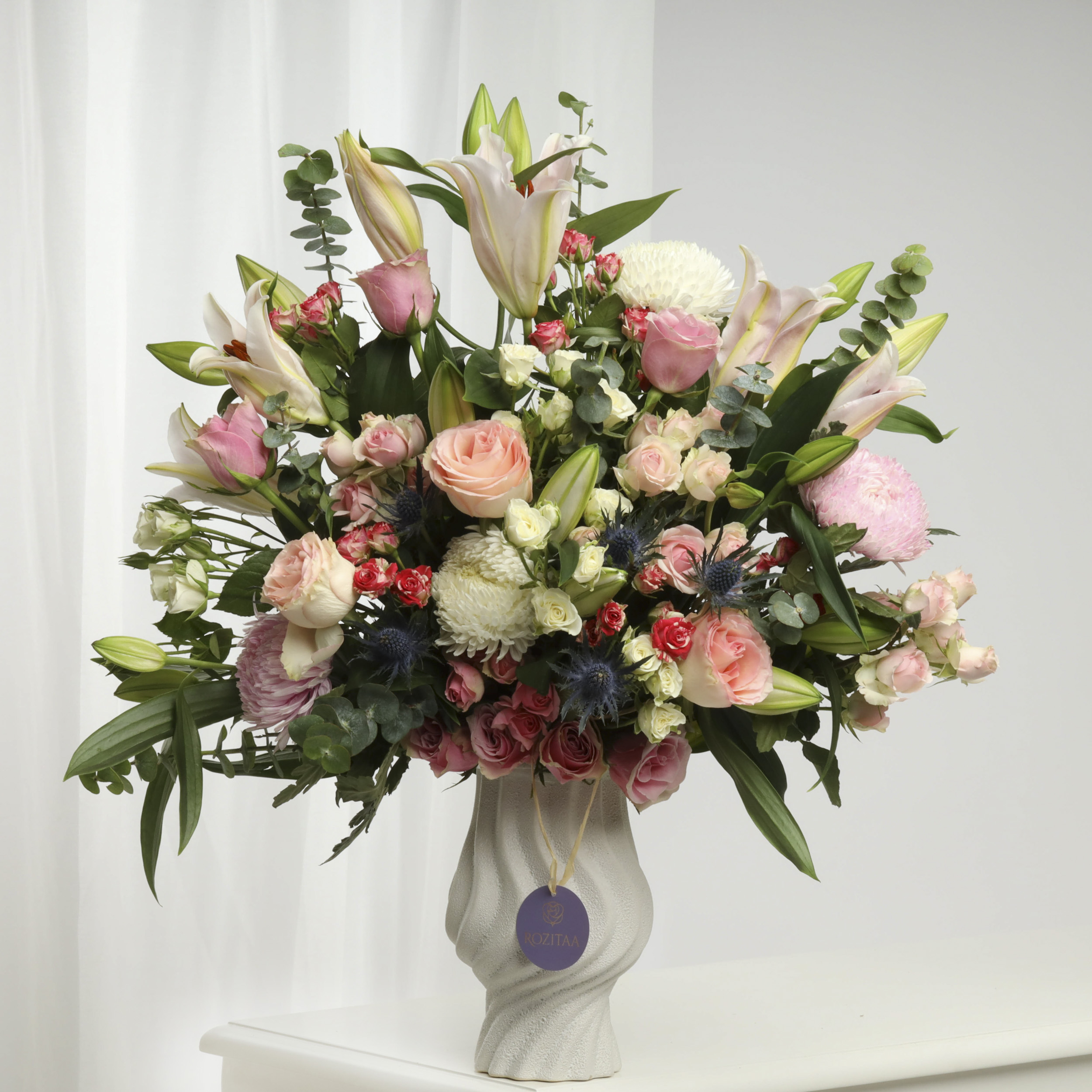 10 جوري وردي، 3 بيبي روز وردي، 5 بيبي روز دبل كلر أحمر، 4 ليليوم وردي، 2 ليليوم أبيض، 6 إيكالبتس أخضر، 6 ماسنجانا أخضر، 4 بيبي روز أبيض، 1 رينجوم موف، 1 فازة مصيص أبيض