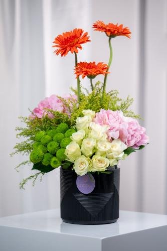 10 جوري أبيض، 4 كريس أخضر، 6 سلداجو أخضر، 2 هيدرنجيا وردي، 3 جلبيرا برتقالي، 1 فازة سودا مخطط أسود