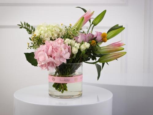 1 هيدرينجيا أبيض، 1 هيدرينجيا وردي، 3 بيبي روز أبيض، 2 ليليوم وردي، 3 روز موف، 5 بابونج أبيض، 1 بستشيا جرين، 1 فازة أسطوانية 40×15