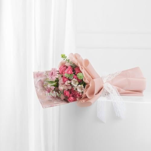 2 جيربيرا وردي، 5 بيبي روز وردي فاتح، 2 الستروميريا موف فاتح، 3 كولوبتس أخضر، 5 بيبي روز فوشي، 4 تغليف مشجر وورقي لحمي