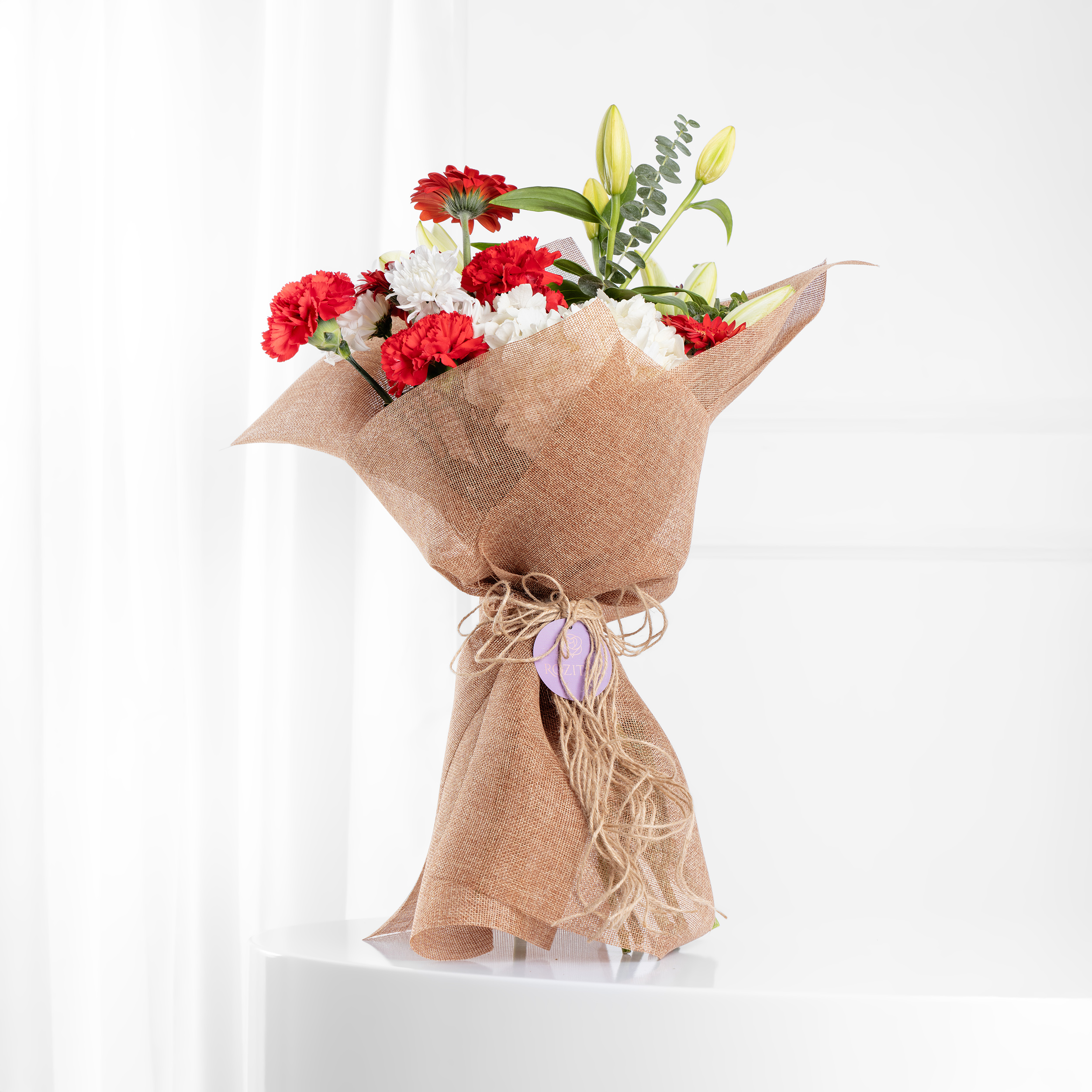 1 ليليوم أبيض، 4 قرنفل أحمر، 3 جولبيرا أحمر، 1 هيدرنجيا أبيض، 1 كريز أبيض، 2 كولوبتوس أخضر، 1 تغليف خيش بني