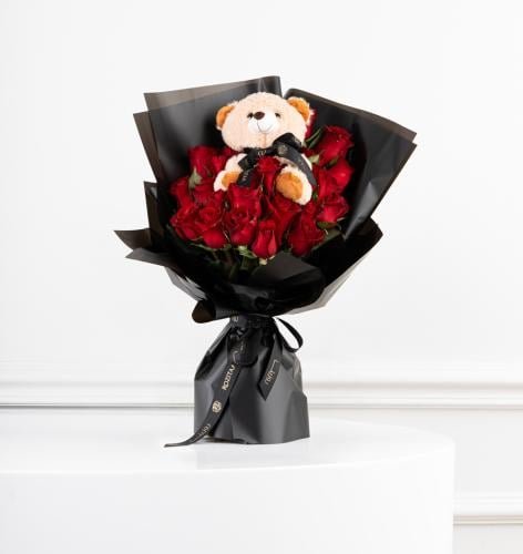 30 بيبي روز – أحمر، 3 تغليف أسود ، 1 شريط ابيض، 1 دبدوب – أحمر