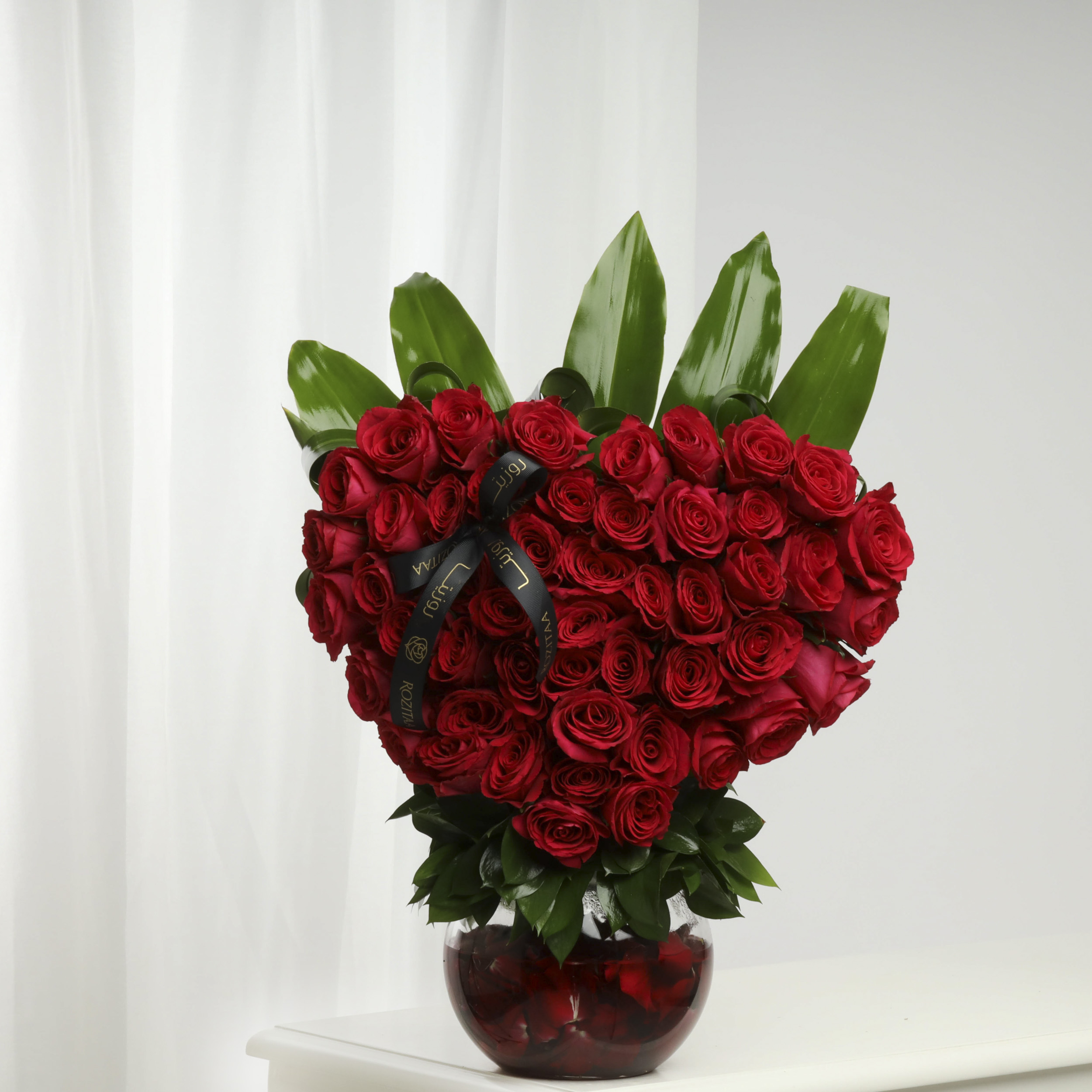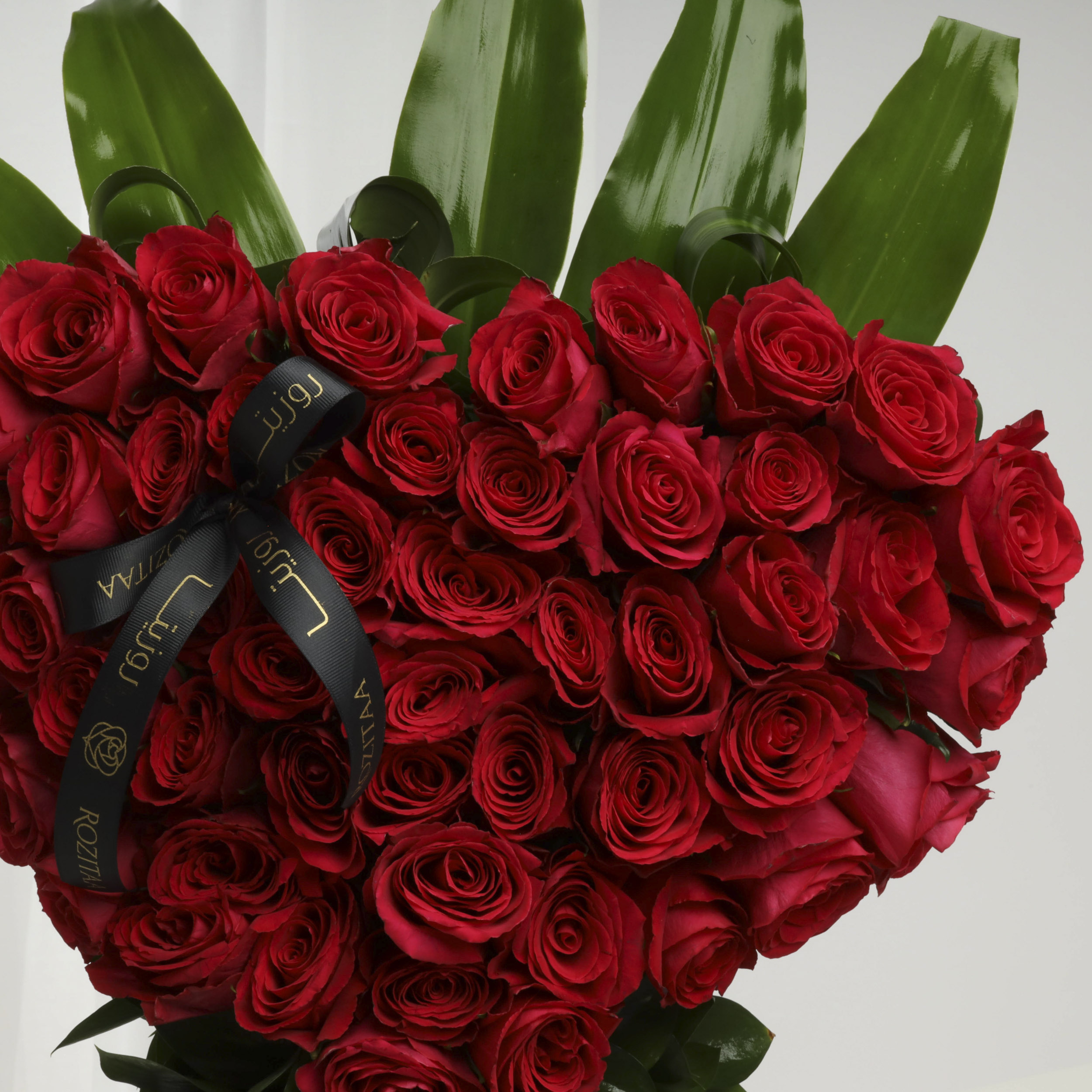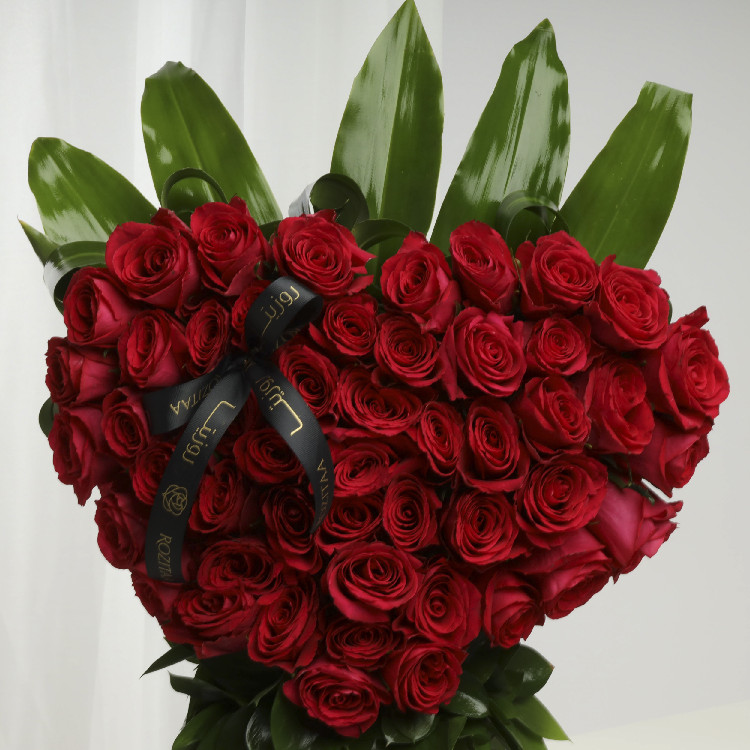 50 جوري – أحمر، 15 ماسنجان – أخضر، 6 رسكس – أخضر، 1 فازة زجاج 25×25 – شفاف