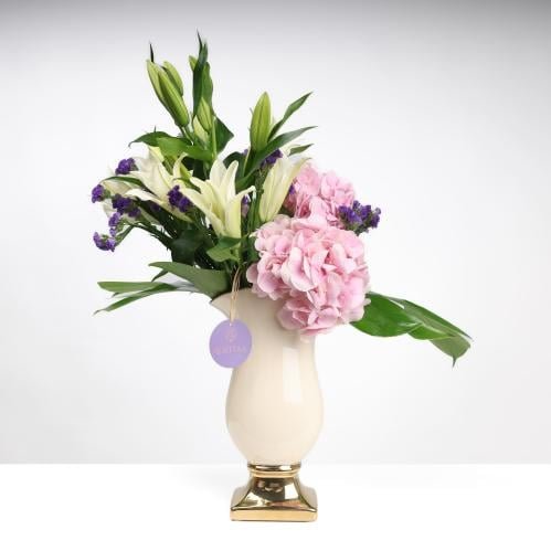 هيدرنجيا بنك 2، ليليوم أبيض 3، استاتس بلو 5، منستيرا جرين 2، فازة سيراميك سكري بقاعدة ذهبية هدية 1