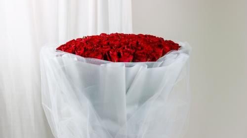 100 جوري أحمر، 8 تغليف كتان أبيض، 4 شرار نجوم الليل، 2 فوم، 2 بالون قلب هيليوم أحمر، 0.1 تغليف دانتل أبيض